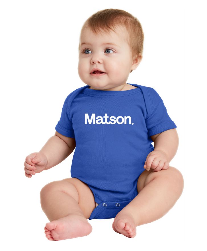 Royal rabbit skin infant short sleeve baby rib bodysuit with white Matson Logo.